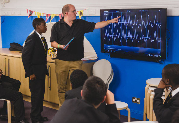 The workshops, which were organised jointly by Imperial and the Royal Albert Hall, included a variety of interactive activities designed to enlighten and inspire the pupils, such as using a slinky spring to demonstrate soundwaves and a tuning fork to show that sound travels through solids. Pupils compared the speed of sound in air (around 340m/s) to the speed of a car, a bullet train, and Usain Bolt.