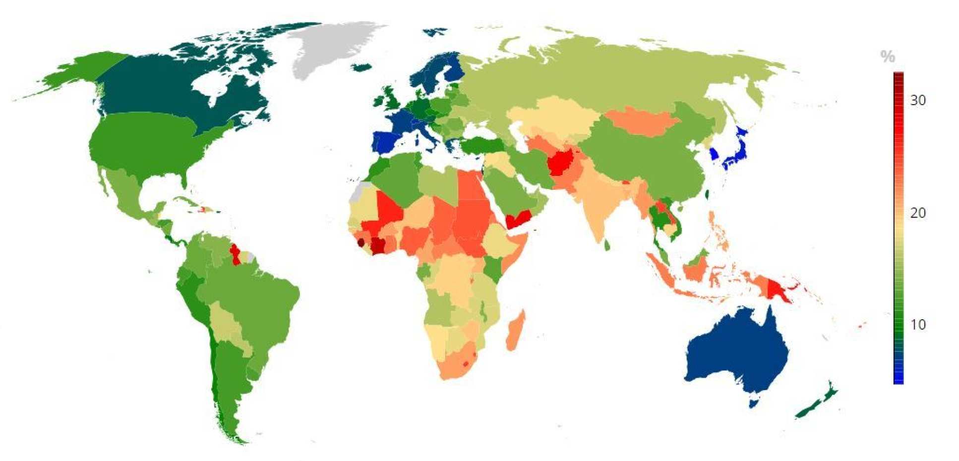 World map showing the probability of dying early from chronic disease between 30 and 70 years of age