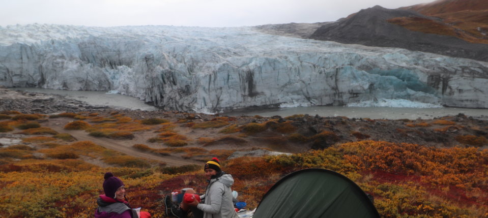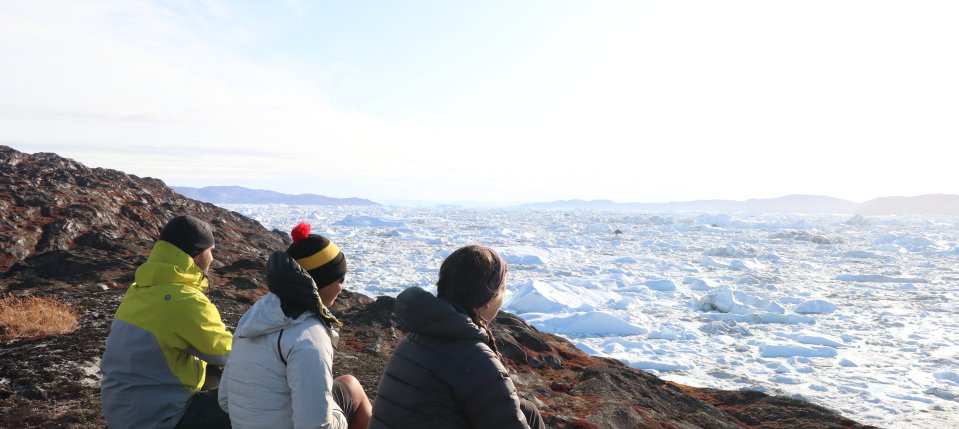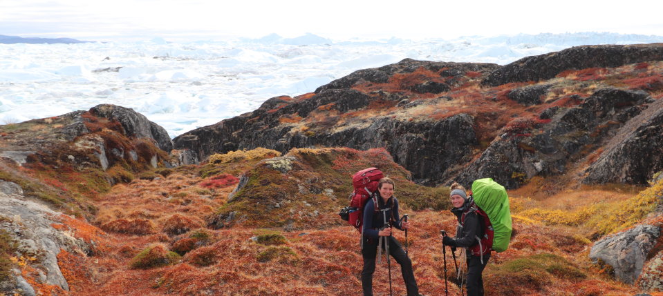 They then took the overnight ferry north to Ilulissat, passing icebergs and playful whales before arriving at the fjord where they camped. The hike to Aaliafarick involved much elevation and a terrain change from the Greenlandic vegetation to rocky, however the site delivered panoramic views of the icecap, the fjord and the sea. The next camp site was by the UNESCO heritage site boundary where they enjoyed the sight of icebergs, a pretty sun set, and whales swimming close to the shore. Just before sunset on the final day the group took a boat cruise around the mouth of the fjord where they saw more than 20 whales. They returned to Ilulissat for a celebration, before 2 of the team travelled onto Qeqertarsuaq, a small village on the volcanic Disko Island off the west coast of Greenland, where they explored the surrounding area for the last few days.