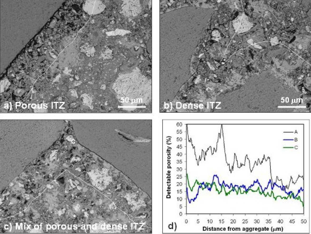 The ‘interfacial transition zone’ (ITZ) refers to the paste region surrounding each aggregate particle in concrete. The ITZ is structurally inferior because it contains higher porosity (Fig. 1) and lower cement content than the ‘bulk’ paste region farther away. Microcracks often initiate and propagate preferentially in the ITZ. It is generally thought that penetration of deleterious species occurs mainly through the ITZ and this forms the basis of many transport models for concrete.