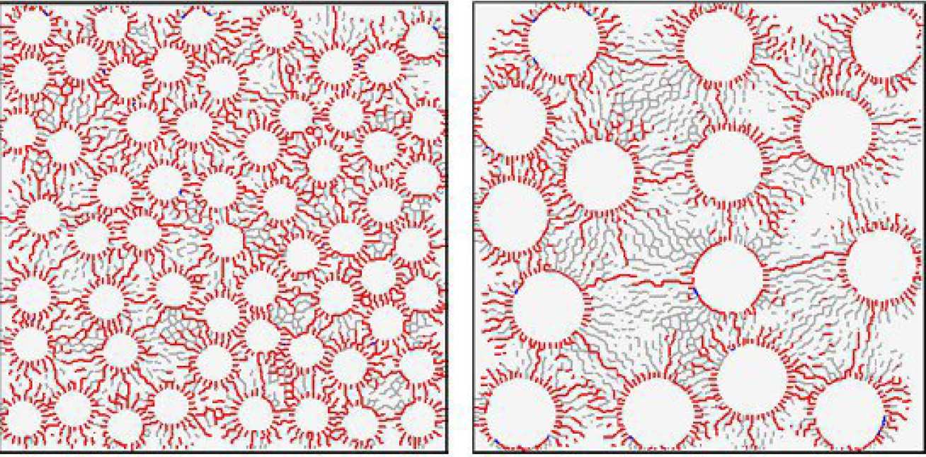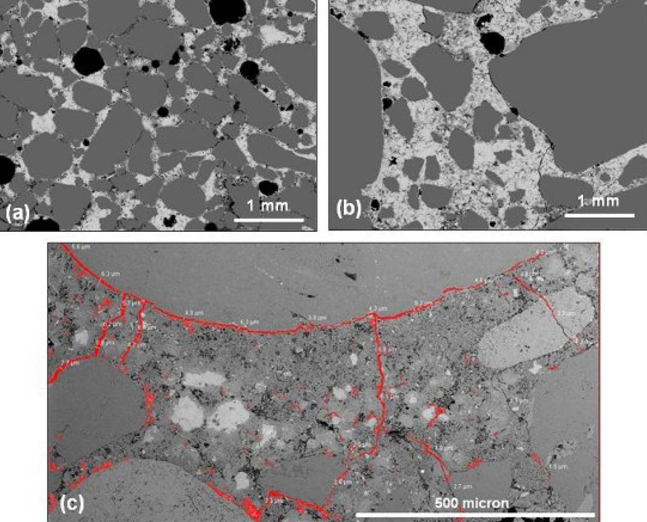 The experimental results are supported by numerical modelling, for example by applying a three-phase composite sphere model to examine the influence of ITZ on steady-state chloride diffusivity2. Results from lattice-based finite element modelling of shrinkage-induced microcracking (Fig. 4) also showed that the higher permeability in concrete is due to wider cracks that form, as a result of the larger aggregate size in concrete.