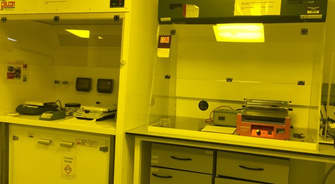 Our wet lab facility contains 16 fume hoods and a range of equipment for chemical synthesis and sample preparation: