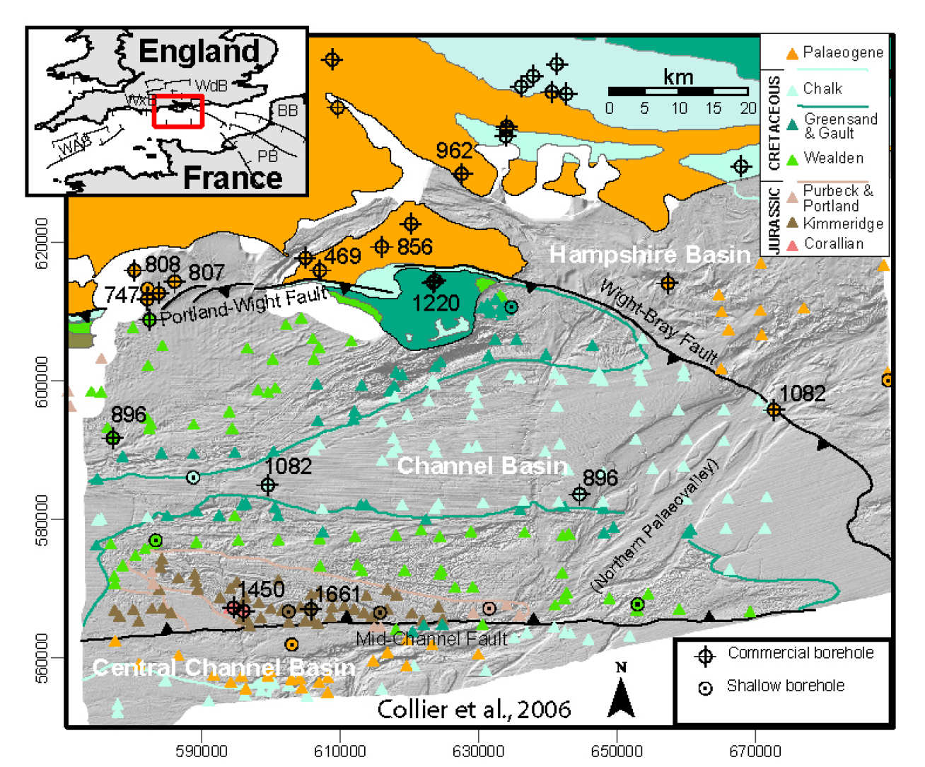 Collier, J.S., S. Gupta, G. Potter, A. Palmer-Felgate (2006). "Using seabed bathymetry to identify inversion stuctures on the English Channel shelf", Geology, Vol. 34, 1001-1004. PDF