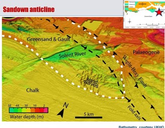 We used a compilation of single-beam bathymetry to unravel the development of a Mesozoic basin on the UK continental shelf. The basin lies just south of the Isle of Wight – a classic area of English geology – where spectacular cliff exposures of near-vertical rocks are evidence of the same compressive forces that formed the Alps. The offshore structures are seen in remarkable clarity as strong tides in the English Channel sweep away loose sediments that would otherwise mask them (Fig.1). The new data shows folding and faulting of the rock layers with unprecedented detail. The images are best where the geological layers are steeply dipping, and so compliments the traditional seismic method of determining off-shore structure. An accurate map of the bedrock geology can therefore be produced (fig.2).The work shows that as the basin was squeezed during the Alpine compression, soft, thinly bedded rocks were extruded out towards the sides of the basin, whereas stronger, thicker bedded rocks were folded into more open structures. The work therefore emphasizes the importance of the mechanical properties of the basin fill in controlling its later development.