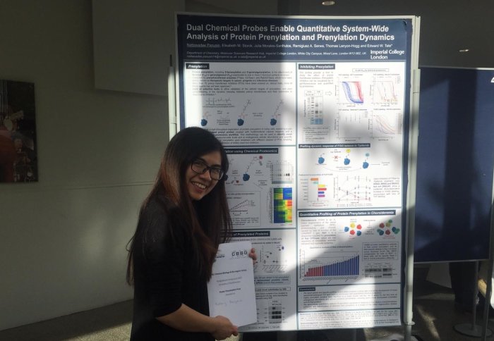 4th year ICB CDT PhD student Nattawadee Panyain was awarded first prize for her poster at the RSC Chemical Biology and Bioorganic Group’s postgraduate symposium last month at the University of Southampton.