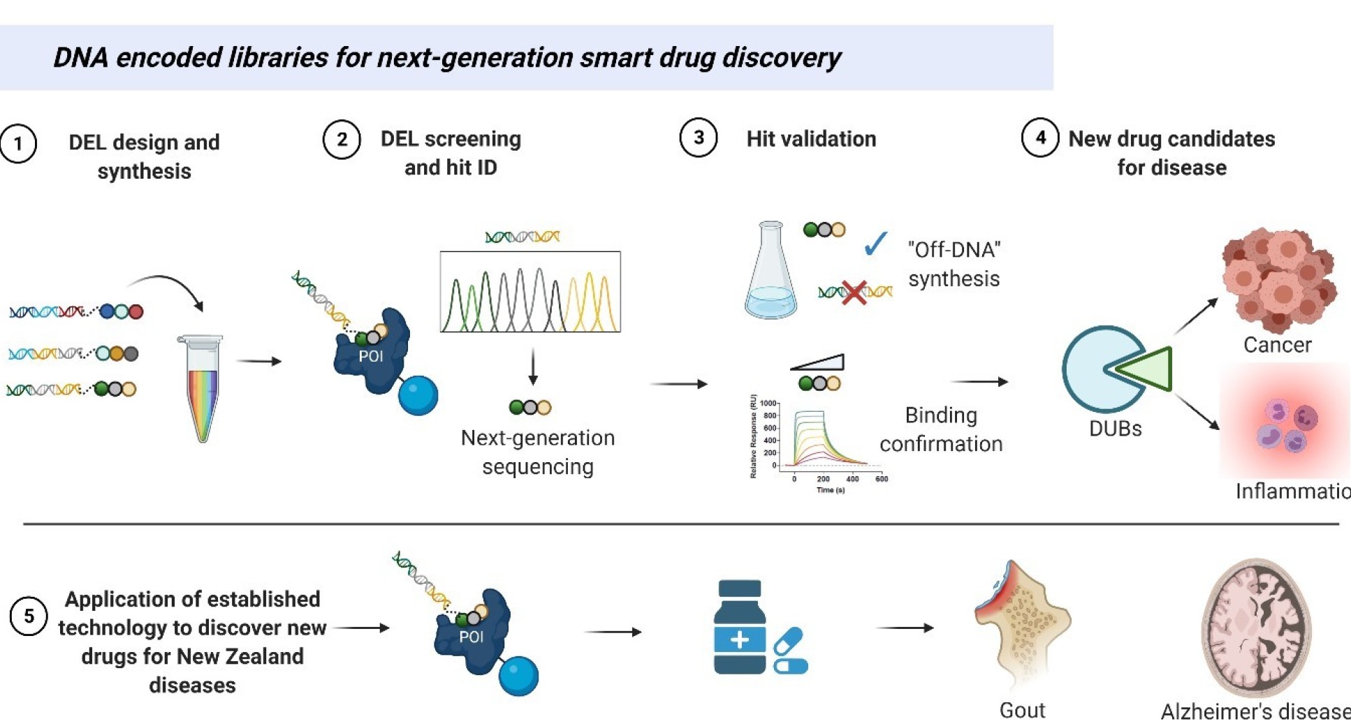 Daniel’s Hercus fellowship will establish a next generation, smart drug screening research programme at the University of Auckland, centred around DELs. DELs are a new high throughput screening technology that is faster, cheaper, and more convenient than conventional methods.
