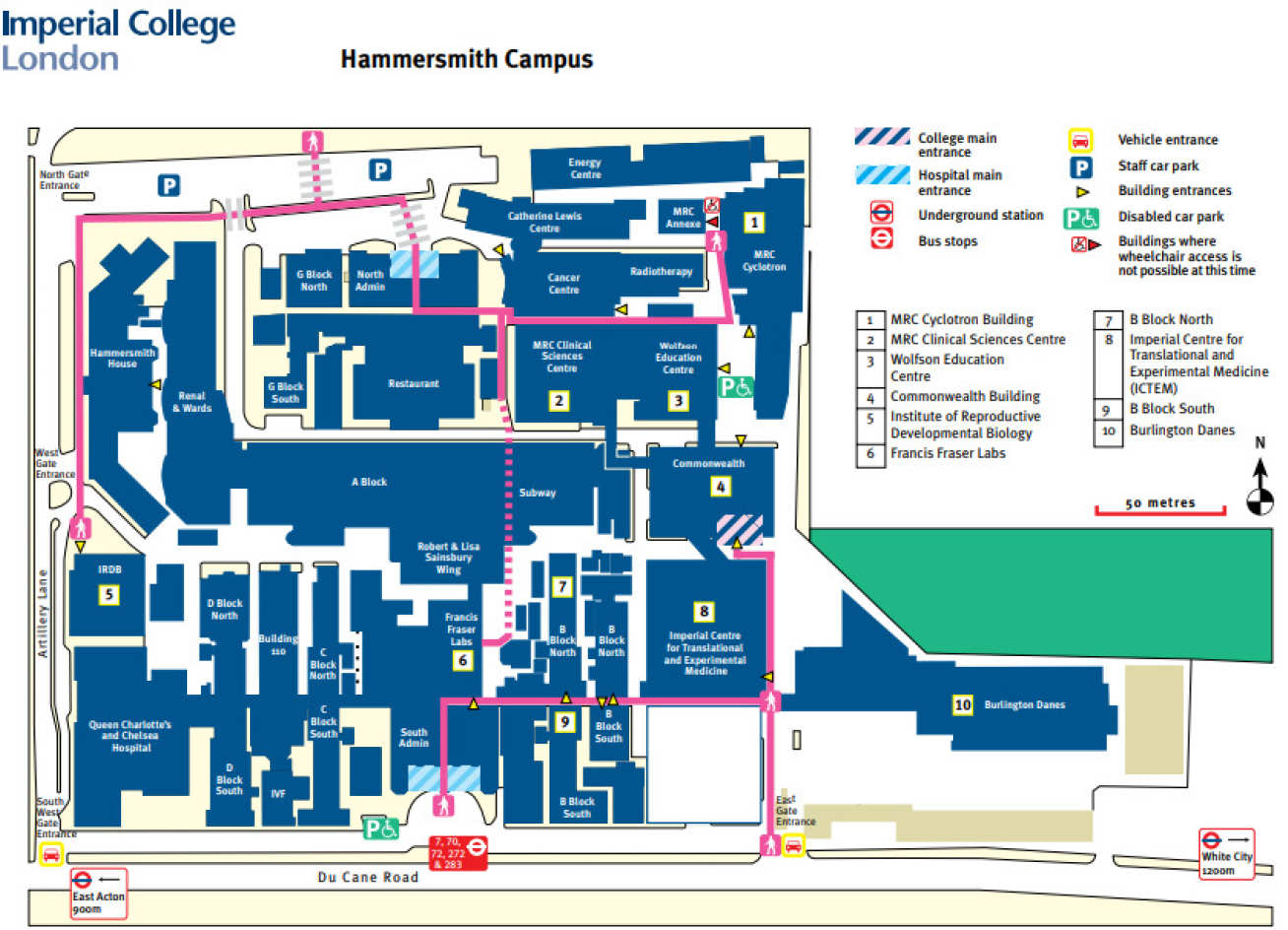 You can also take a 7, 72, 272 or 283 bus from East Acton Station /Fitzneal Street (Bus Stop C) to Hammersmith Hospital (Stop B).