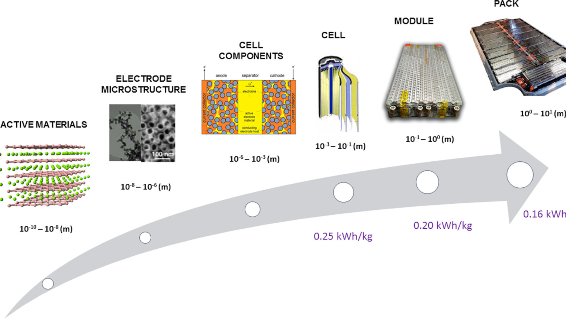 The different scales involved in LIB technology from active materials to cell to pack. At different scales, the fire hazard and the protection strategies are different.