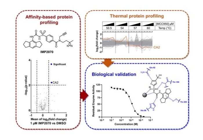 This paper describes the first proteome-wide unbiased target profiles for MCC950. Cassandra designed and synthesised a novel photoaffinitybased probe (AfBP) for MCC950 (IMP2070) and showed that it directly engages with NLRP3 and retains inhibitory activity against the NLRP3 inflammasome. De novo target identification with IMP2070 and thermal proteome profiling further identified multiple potential MCC950 off-targets including carbonic anhydrase 2 (CA2), and biochemical assays confirmed MCC950 as a non-competitive CA2 inhibitor.