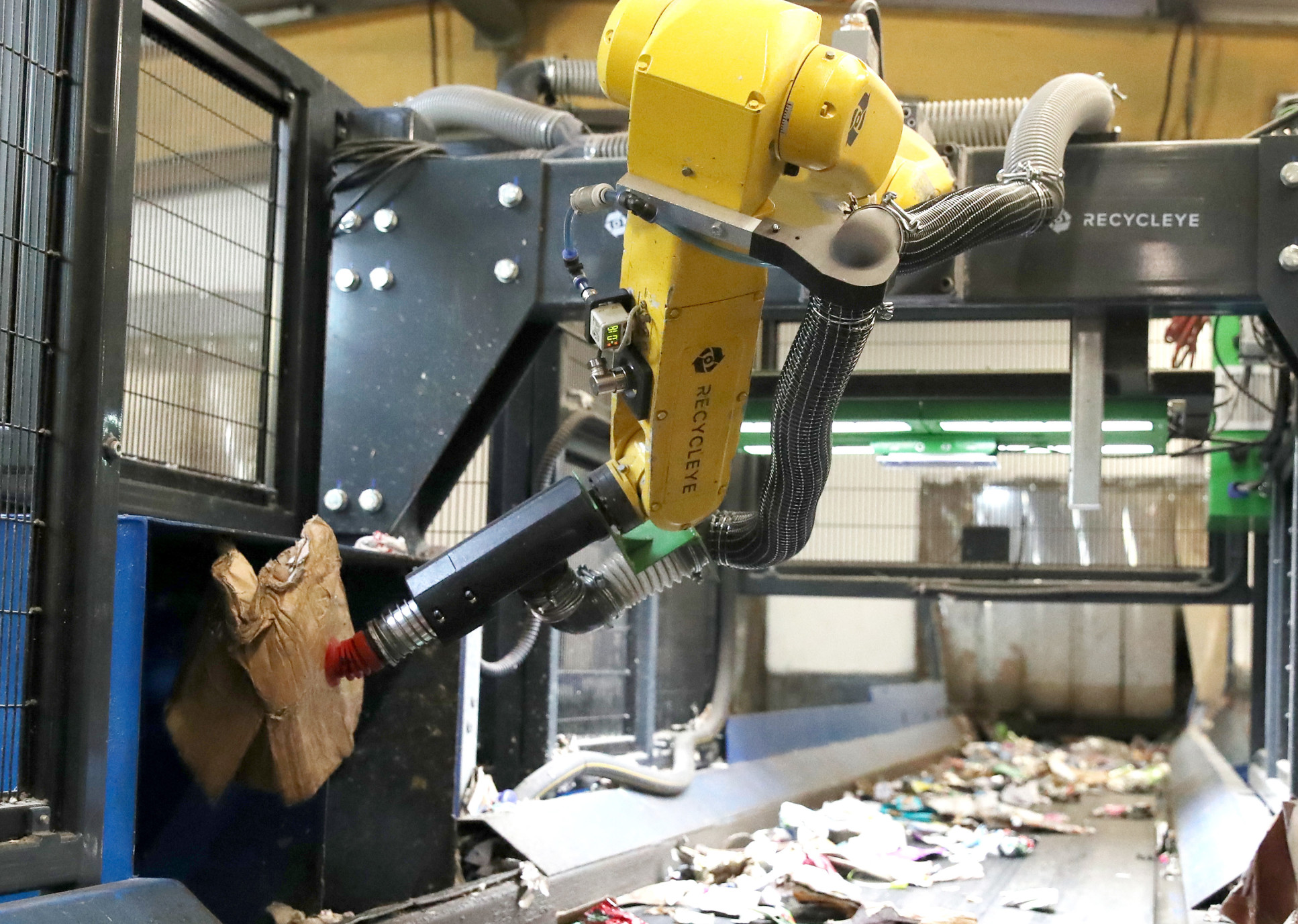 First of all, a camera collects digital images of mixed waste as it passes on a conveyor belt. These images are fed into a machine learning algorithm, which identifies individual items in the waste stream and ranks them in terms of picking priority. This data is then sent to a robotic arm that picks up and separates out the desired items for recycling, or removes contaminants to clean up the waste stream.