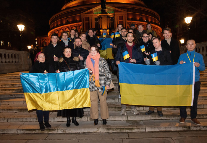 Imperial staff and students hold a vigil outside the Royal Albert Hall to mark the first anniversary of the invasion of Ukraine