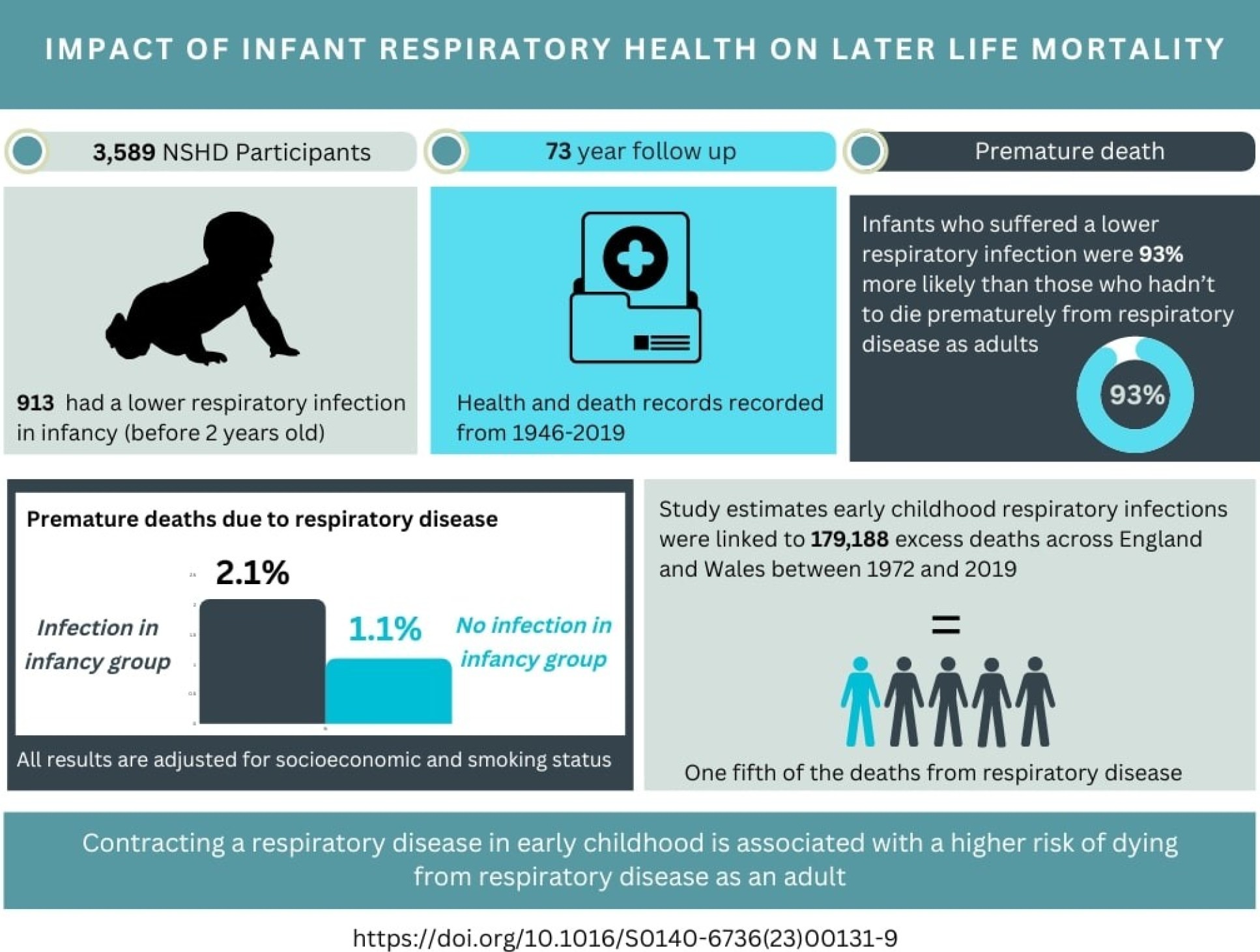 The study uses data from a nationwide British cohort study called The National Survey of Health and Development (NSHD), which recruited individuals at birth in 1946, to look at health and death records for 3,589 people up until 2019. Of the 3,589 study participants, 913 suffered a lower respiratory infection before the age of two.