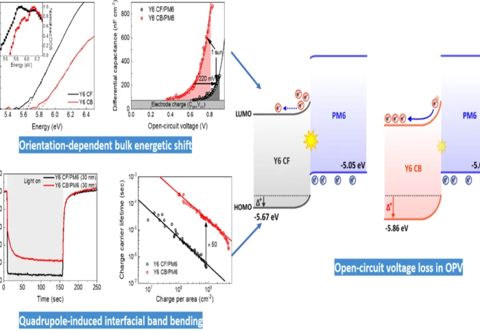 Researchers at Imperial College London, in collaboration with Samsung Electronics, have unveiled how this interfacial energetics is controlled simply by the molecular orientations. They have demonstrated a significant energetic shift (> 200 meV) depending on the molecular orientation of Y6, a state-of-the-art NFA, in the film, switching from face-on to more edge-on orientation, which is assigned to the large molecular quadrupole moments of Y6 affecting its electrostatic potential. They have identified the impact of such energetic shift on OSC performance. The larger quadrupole-induced interfacial band bending assists better charge separation, leading to the changes in effective electronic bandgap and internal quantum efficiency of both planar bilayer and blended bulk-heterojunction devices.