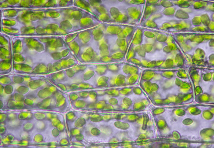 Chloroplasts in a leaf under a microscope