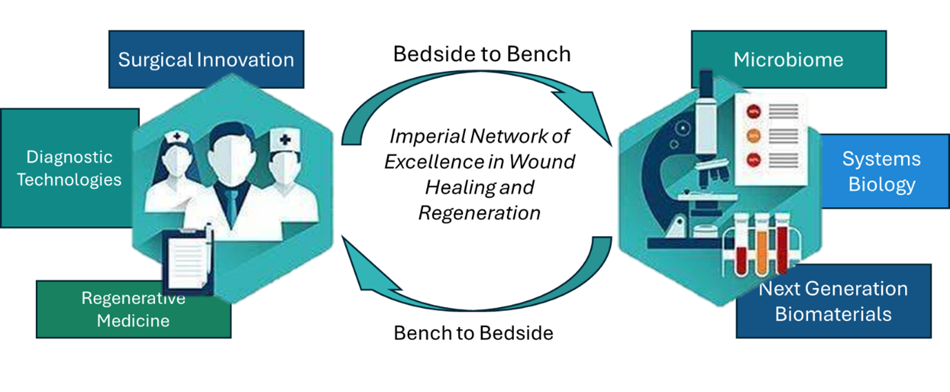 The Imperial Network of Excellence in Wound Healing and Regeneration is a multidisciplinary research initiative uniting engineers, scientists and clinicians (doctors, nurses and allied healthcare practitioners) around the fundamental grand challenge of delivering innovative and ground-breaking treatments for wound healing and scar augmentation that will deliver significant clinical impact and benefit to patients. The Network strives to use and develop core engineering technologies in an unrivalled transdisciplinary research environment where clinical advances in wound healing and regeneration are enabled in a way that is not currently possible with single discipline approaches.