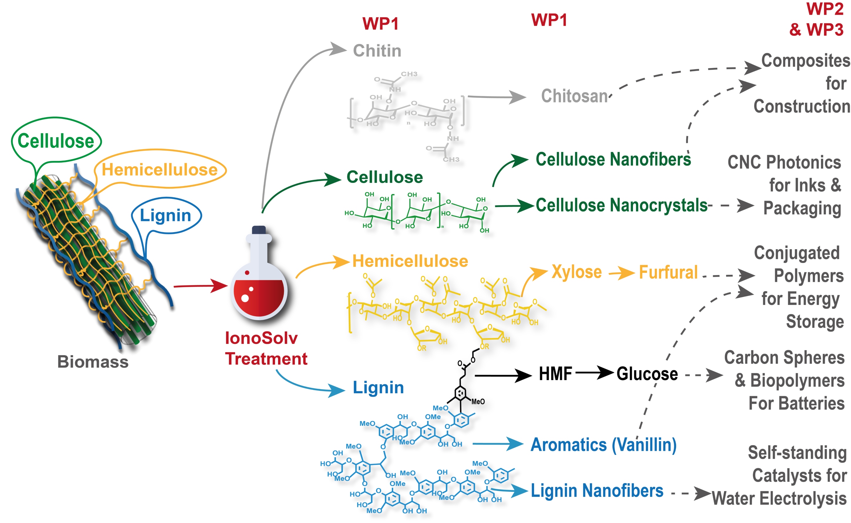 This WP is establishing design rules based on a fundamental understanding for green and efficient harvesting of bio-based precursors from food, forestry, and agricultural waste provided by our project partners. Multidisciplinary expertise in plant biochemistry for understanding the cell wall of different biomass streams (PD) is key, allowing both the design of tailor-made materials (as in WP2) and the development of sustainable solvents (JH) to extract desired pure components from biomass (e.g., cellulose, lignin, chitin, pectin, hemicellulose) and further convert them into chemicals (e.g., fructose, glucose, xylose, furfural, 5-hydroxymethylfurfural) in a reproducible and saleable manner. These biorefinery routes are being supported by LCA (NS-WP5) to ensure sustainability and optimised using ML (AL-WP4) and HT approaches (CP-WP4).