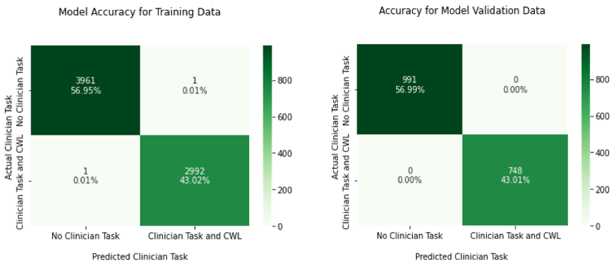In this section, the binary classification results obtained by the transfer learning approach suggested in Figure 3.6 are presented. The binary classification approach aims at determining the presence of CWL that may result from a surgical task. We define two main classes for binary classification, i.e., a) Clinician task in which a CWL is the consequence of a number of surgical tasks, and b) No Clinician Task or no CWL. A data set that involves 22 channels for fNIRS and 18 for EEG respectively, and a sampling window of 200 readings was found to be optimal, and Pupil data that contains the information of the geometry of each surgeon’s pupil. The average of all EEG signals and average of all channels for fNIRS was calculated and then both were concatenated in an input matrix Xi=200samples + Pupil data. Data set was split into two subsets, i.e., a) 70% for training, and b) 30% for validation the suggested model based on transfer learning.