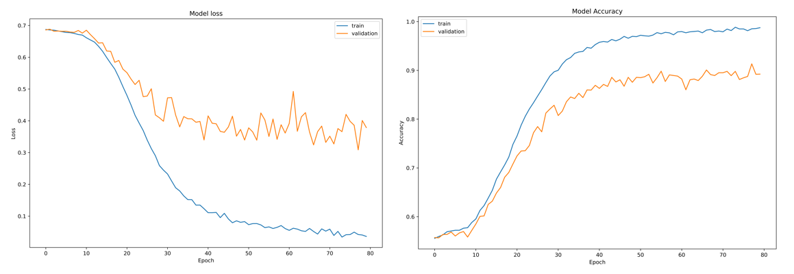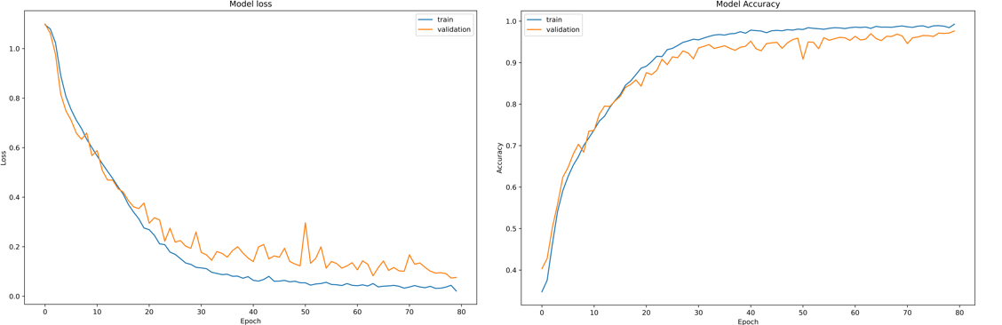 Finally, to demonstrate the evolution of the cross-validation process of a 1D-CNN for multiclass classification, in Figure 3.22, the evolution of the loss and its corresponding model accuracy for 80 training epochs is illustrated.
