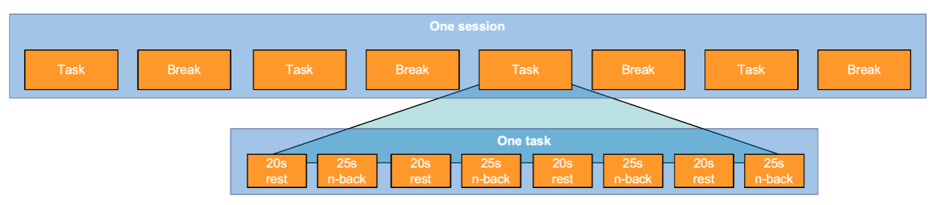 As shown in Figure 3.17, each experimental session contains four tasks, including a control task with no N-back task as well as an N0, N1 and N2 back task in randomised order. Additionally, there is a 30-second baseline recording before each task. Each 3-minute task includes 4 repetitions of the N-back task (each repetition lasts 45s).
