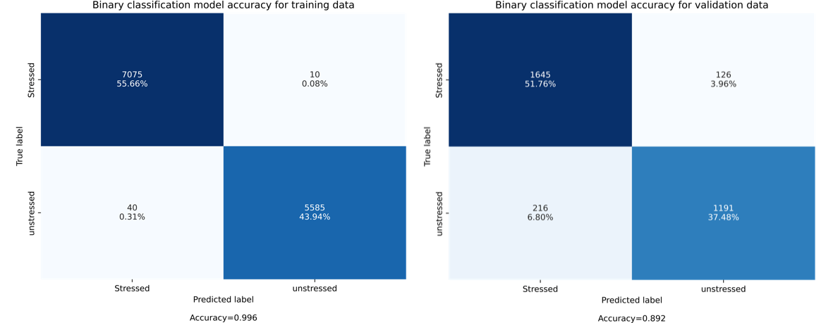 To test the performance of the proposed neural architecture, a binary classifier was trained to discriminate the surgeon activities when a a) single task or b) dual task (not stressed or stressed) is performed. As shown in Fig. 3.19, the resulting confusion matrix for training and validation of the proposed stage-one 1D-CNN is presented. An overall accuracy of 99.62 % and 89.24% for training and validation is provided by the proposed 1D CNN in the initial stage. The corresponding evolution of the proposed 1D-CNN is presented in Figure 3.20.