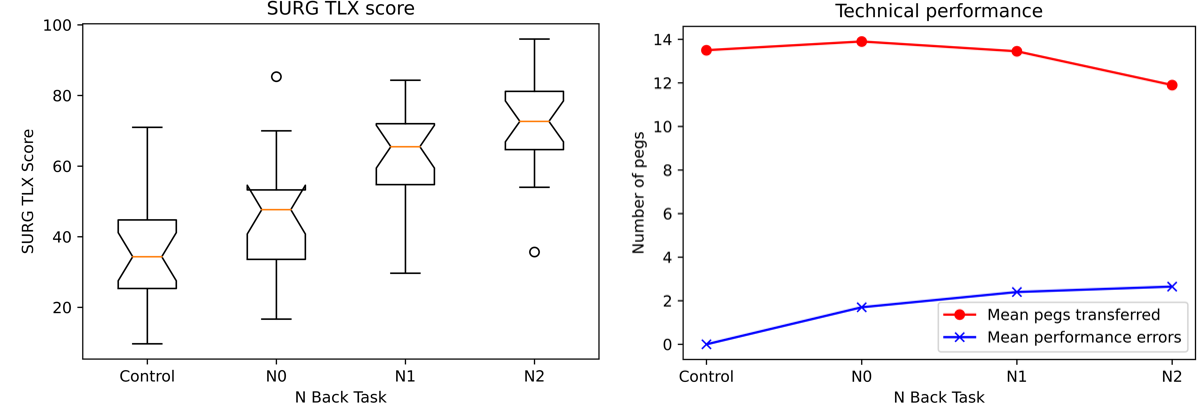 20 surgical trainees were asked to undertake a laparoscopic task (peg transfer) whilst undertaking a cognitive task (N-back test) of varying difficulties. The N Back test is a task used in cognitive neuroscience to increase working memory. Participants performed a control task with no N-back task as well as an N0, N1 and N2 back task in randomised order. Eye tracking measures and heart rate sensors were synchronised and used to objectively measure mental workload. Subjective workload measures were recorded using a questionnaire call the SURG-TLX, a validated tool used in surgery to measure workload levels. Additionally, video capture data records the on-screen procedure [1-3].