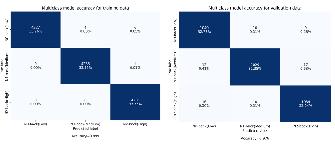 In the second stage of this experiment, a multiclass classifier detects is implemented to detect three states of the cognitive workload (CWL) denoted as 1) low, 2) medium, and 3) high, corresponding to N0-back, N1-back, and N2-back respectively. In this sense, the corresponding confusion matrix for the training and validation of the proposed two-stage 1D-CNN is show in Figure 3.21. An overall accuracy of 99.99% and 97.64% for training and validation (testing) is produced by the 1D-CNN, for stage 2.