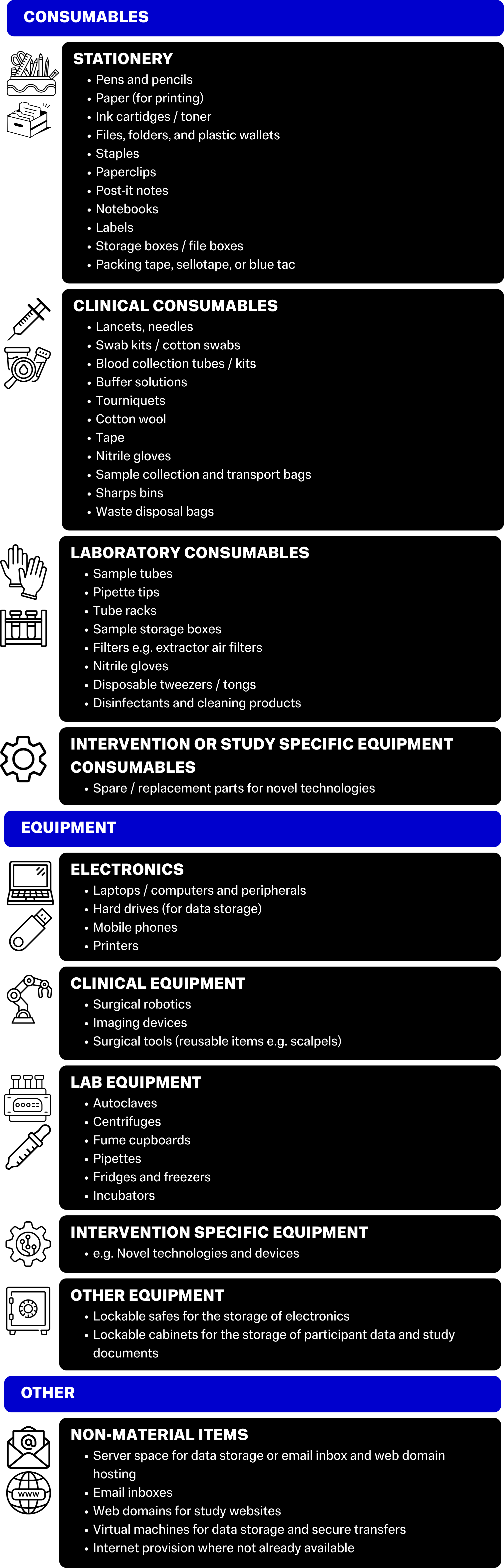 Consumables refers to all items necessary for the trial to function that are single use, or are parts for equipment that will need to be regularly replaced.