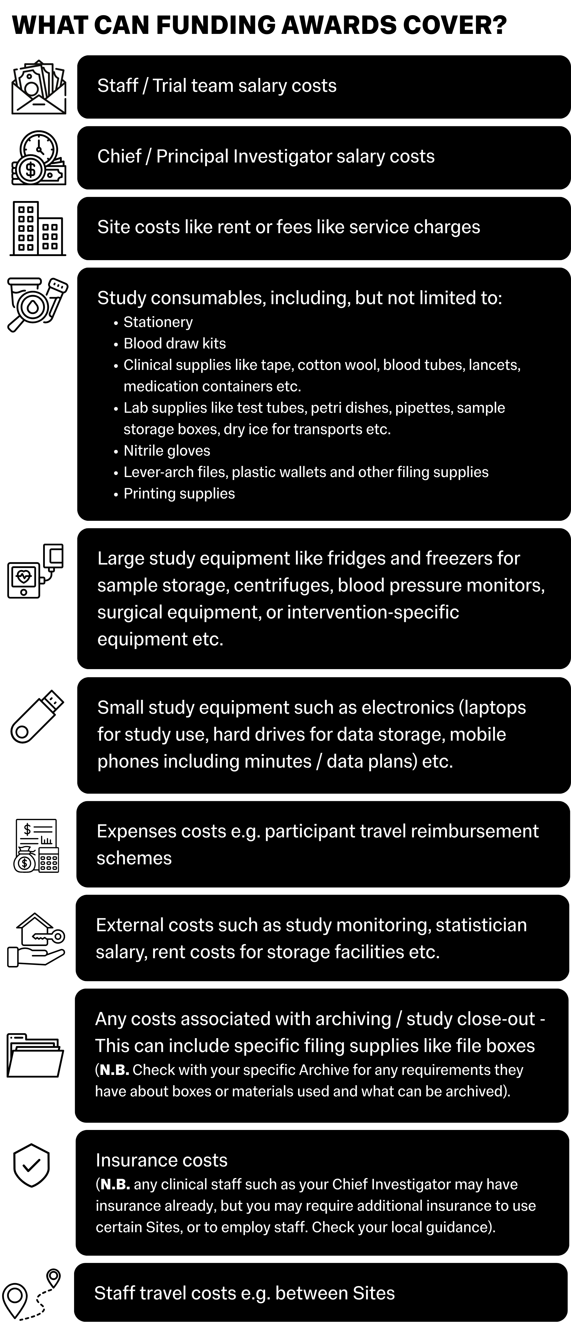The budget items to include will vary between funding bodies, as will the items a funding body can / will cover as part of an award. For example, some funding bodies can cover all costs associated with a trial, whereas other funding bodies may only cover study consumables and site costs but not staffing costs. Another useful item to note is the overall award amount, and how many projects the funding body intends to fund out of that amount. If your proposed budget exceeds the total award amount or would account for a large portion of an award designed to fund multiple projects, you will be less likely to be successful.