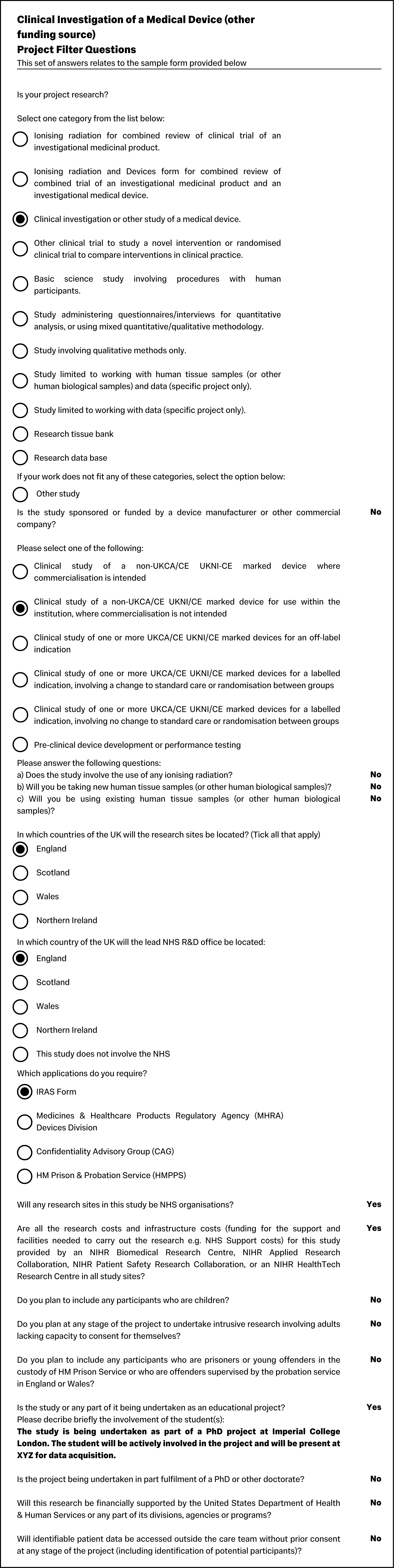 As there is a huge number of possible combinations of answers to the project filter questions that define the IRAS form you need to complete, we have only recorded a small number of the most common forms. If your project does not fall under one of the forms recorded here, you can use the IRAS system to generate the one you need by following these instructions: