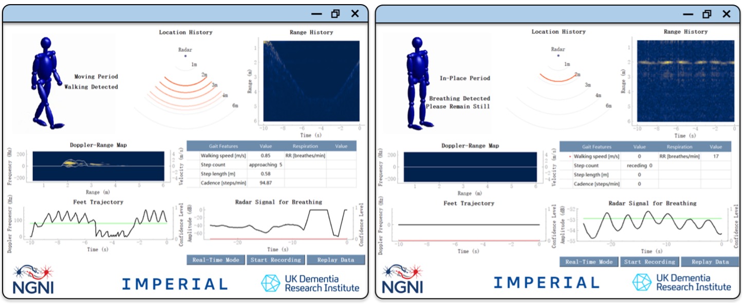 Beyond offline analysis, we have developed and demonstrated real-time radar systems capable of simultaneous gait and respiration monitoring. Live demonstrations and networked radar platforms show that these capabilities can operate continuously at high frame rates and low cost, supporting realistic indoor deployment and paving the way towards scalable health monitoring solutions.