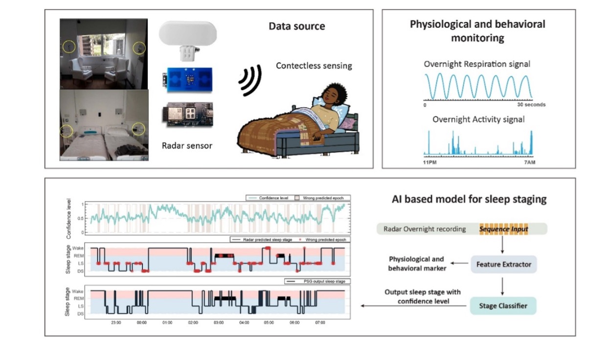 Our sleep research shows that radar can be used to assess sleep and nocturnal physiology unobtrusively in older adults and people living with cognitive impairment. By combining radar-derived motion and respiration features with machine-learning models trained using clinically annotated polysomnography data, we demonstrate the feasibility of sleep staging and detection of abnormal breathing patterns in settings where traditional sleep studies are impractical.