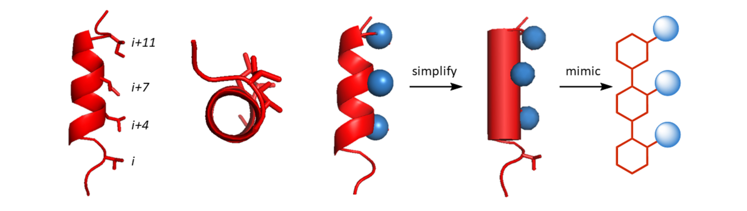 Another commonly used class of molecules used to target protein-protein interactions are helix mimetics. Helix mimetics are a unique class of PPI inhibitor since they present binding groups in approximately the same orientation as key amino acid residues in the helical component of a PPI.