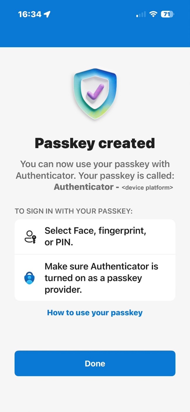 In order to use passkeys on the Microsoft Authenticator App, your device will need to be running at least Android 14 or iOS 17. You will also need to have the latest version of the Authenticator app installed. (If you are having any issues please see the MFA and Passkeys FAQs.)