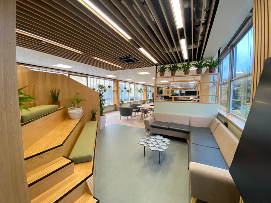 - Material retention: 80% of the timber panelling, all circulation flooring, and integrated planting were retained from the Living Lab, preserving its calming and biophilic design language.
