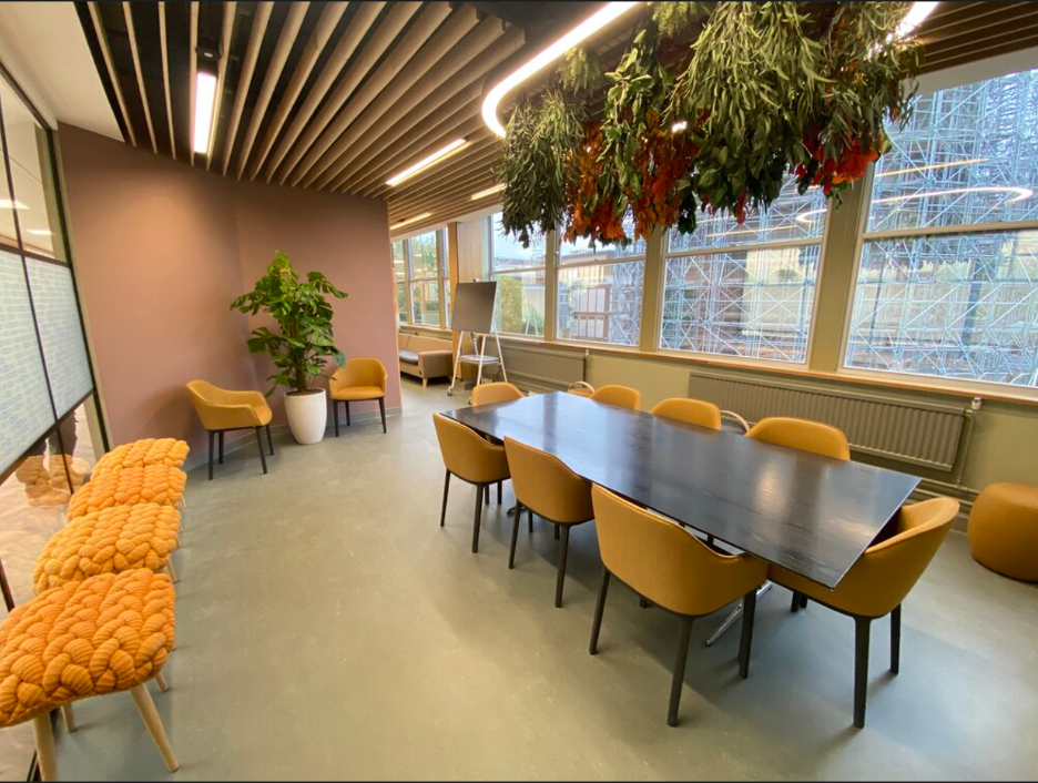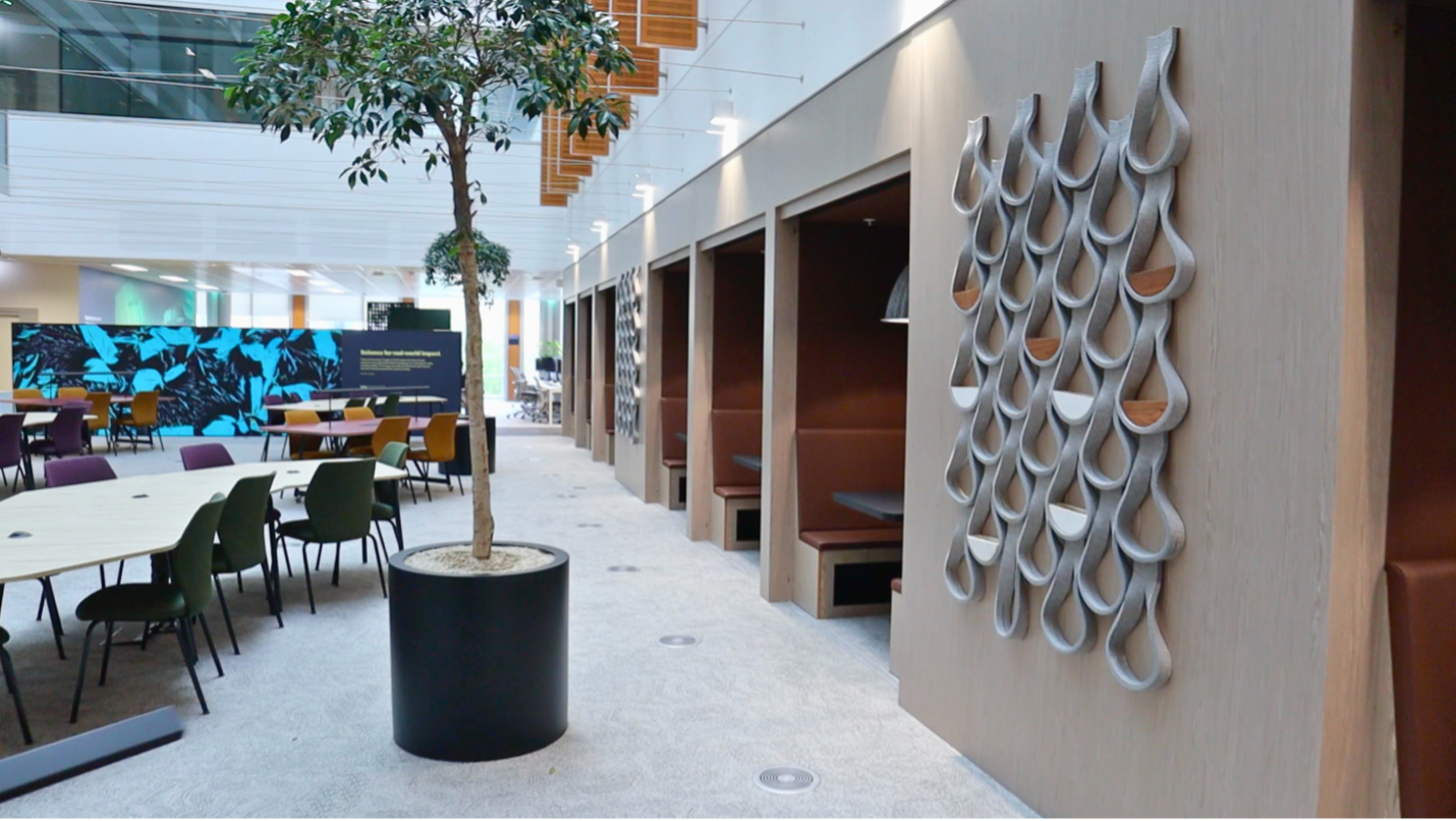 - Biophilic and Sustainable Materials: Acoustic wall art made from 100% recycled ocean plastic (PET), wood finishes, integrated planting, and sustainable flooring materials such as Marmoleum and recycled vinyl brought warmth and calm to the space.