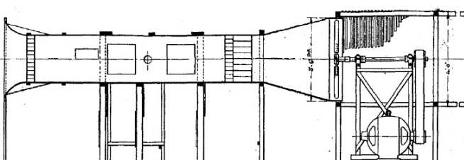 The diagram shows the layout of a typical NPL type open-circuit wind tunnel. Unfortunately no photographs or drawings could be found of the Imperial College wind tunnel. It is known that one of the reasons for building the tunnel was to test models of airships, considered at the time to be important for the future of air transport.