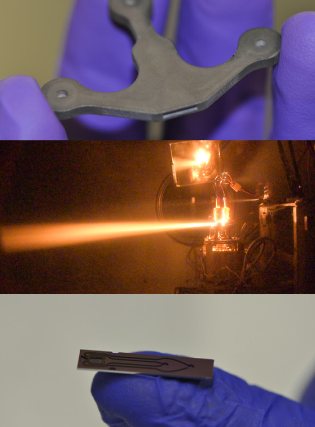 Images: Top - ICE-200 (1N thruster for Small-Mid Sized Satellites); Middle - ICE-200 Hot Fire Test; Bottom - ICE-Cube (5mN thruster for CubeSats)