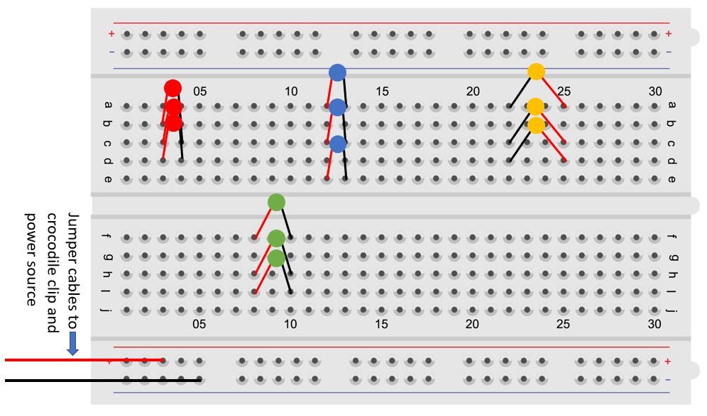 - To power the parallel circuit, connect the positive and negative power rails to any of the remaining two column options for (+) and (-), as you did with the series connection.