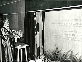 I heard the party enter the lift and it began it assent. As it reached the third floor I poised to open the outer gate but to my astonishment the lift continued to go past up to the floor above. At that moment two of the royal security guards appeared at the staircase and asked where she was, I pointed a finger up and said they have gone past. They then scurried up the stairs but as they did, the lift began to come back down. Once more I took up my position at the gate but the lift continued to go down from whence it came! (Picture left; the opening of the Roderick Hill Building by Her Majesty the Queen Mother)