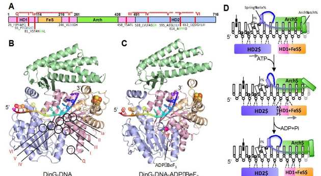 -inducible protein G in E. coli) belongs to the Xeroderma pigmentosum D (XPD) family. It is a Superfamily 2 DNA helicase with 5’−3’ directionality. DinG comprises four domains (panel A) the helicase (HD1 and HD2), arch and FeS cluster domains. Crystal structures of complexes of DinG bound to single-stranded DNA (ssDNA) were determined in the absence (panel B) and presence (panel C) of an ATP analogue (ADP•BeF3). Binding of nucleotide induces a conformational change that involves closure of a cleft between the two canonical helicase domains. Concomitant changes in the interactions between the protein and the bound ssDNA result in unidirectional translocation in a 5’−3’ direction (panel D). The structures improve our understanding of the translocation mechanism of XPD family enzymes as well as explaining how some of the mutations in these proteins cause deficiencies in their activities that have consequences in human disease (Cheng et al. eLife 2018).