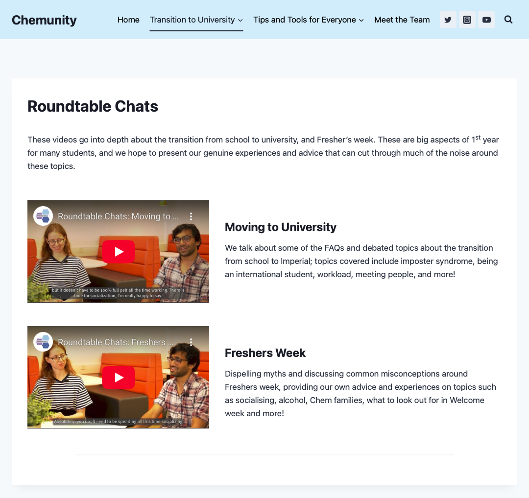 The resources the students generated can be explored on the Chemunity website! You might notice it is separate from our department or Imperial website. An unexpected reflection had been how rarely students used central resources, turning to informal networks more frequently, and consequently our Student Shapers wanted materials to feel authentic and not ‘official’.