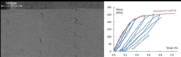 - bio-inspired hierarchical microstructure, with ‘bricks-and-mortar’ architectures at different scales, able to diffuse damage, dissipate energy, and undergo stable unloading-loading cycles after visible damage initiates. This work has been recognised by a Best Poster Award from the European Society for Composite Materials (Joel Henry, 2018).