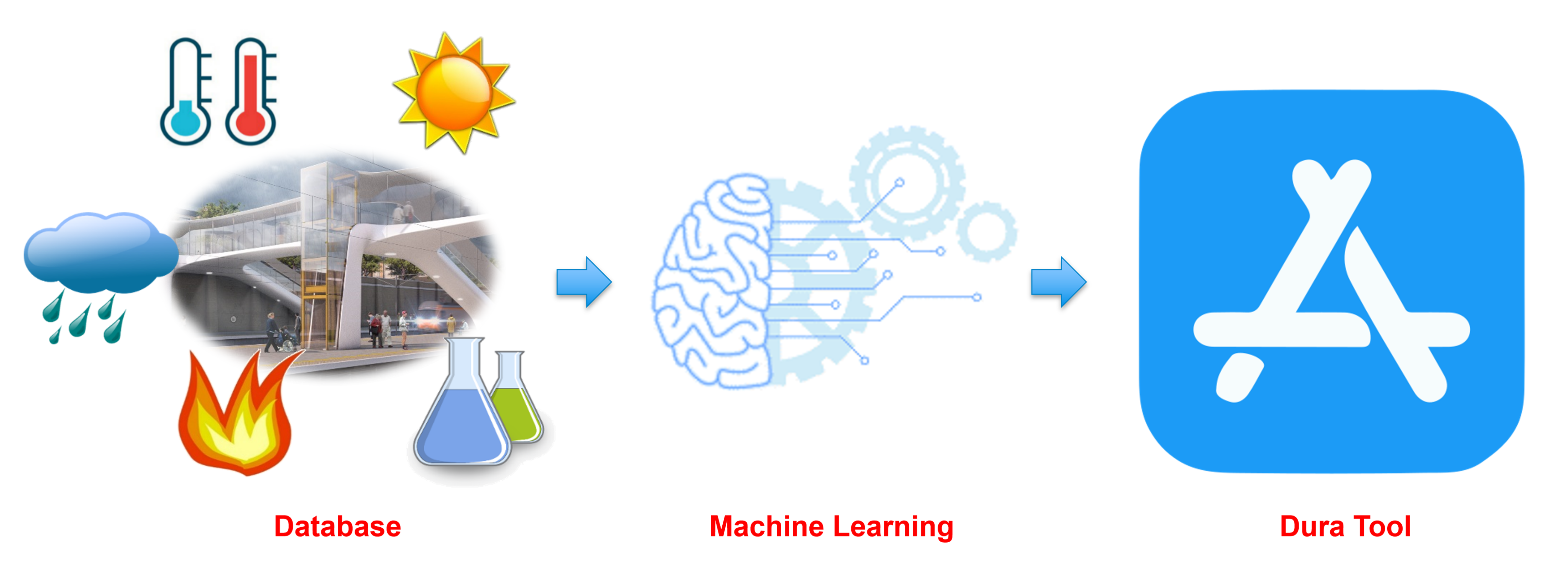 Above figure shows that the composite materials are subjected to complicated environmental conditions during their service life and their material properties degrade with time. Unfortunately it is impossible to predict the degradation due to the complex nature of durability. Machine learning can be used for this particular challenge. It learns from the experimental database from the literature and can be developed into a digital tool called "dura tool" for degradation prediction.