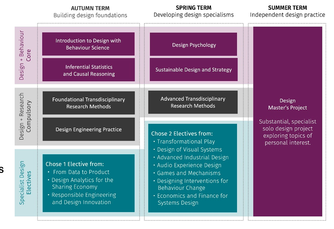 In this programme, you will explore how to incorporate theory, research, and practices in behaviour science into the design of positive outcomes. This will involve learning to understand, develop, and monitor behavioural design interventions through using design-led tools, developing an in-depth understanding of users in their context, and honing your ability to integrate knowledge across disciplines.