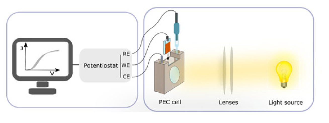 The photoelectrochemical (PEC) measurements are usually conducted in a home-built three electrode cell. An Autolab potentiostat (PGSTAT 101, Metrohm) is used to apply the potential to the cell and the data are recorded with Nova software (Metrohm). Measurements such as linear-sweep voltammetry, cyclic voltammetry, chonoamperometry etc. are performed in a home-built photoelectrochemical set-up illustrated below.