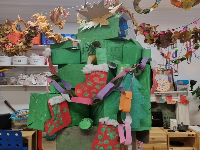 Sunflower also built and constructed art, by making a Christmas Tree out of old recycled cardboard boxes as well as using wooden play blocks.
