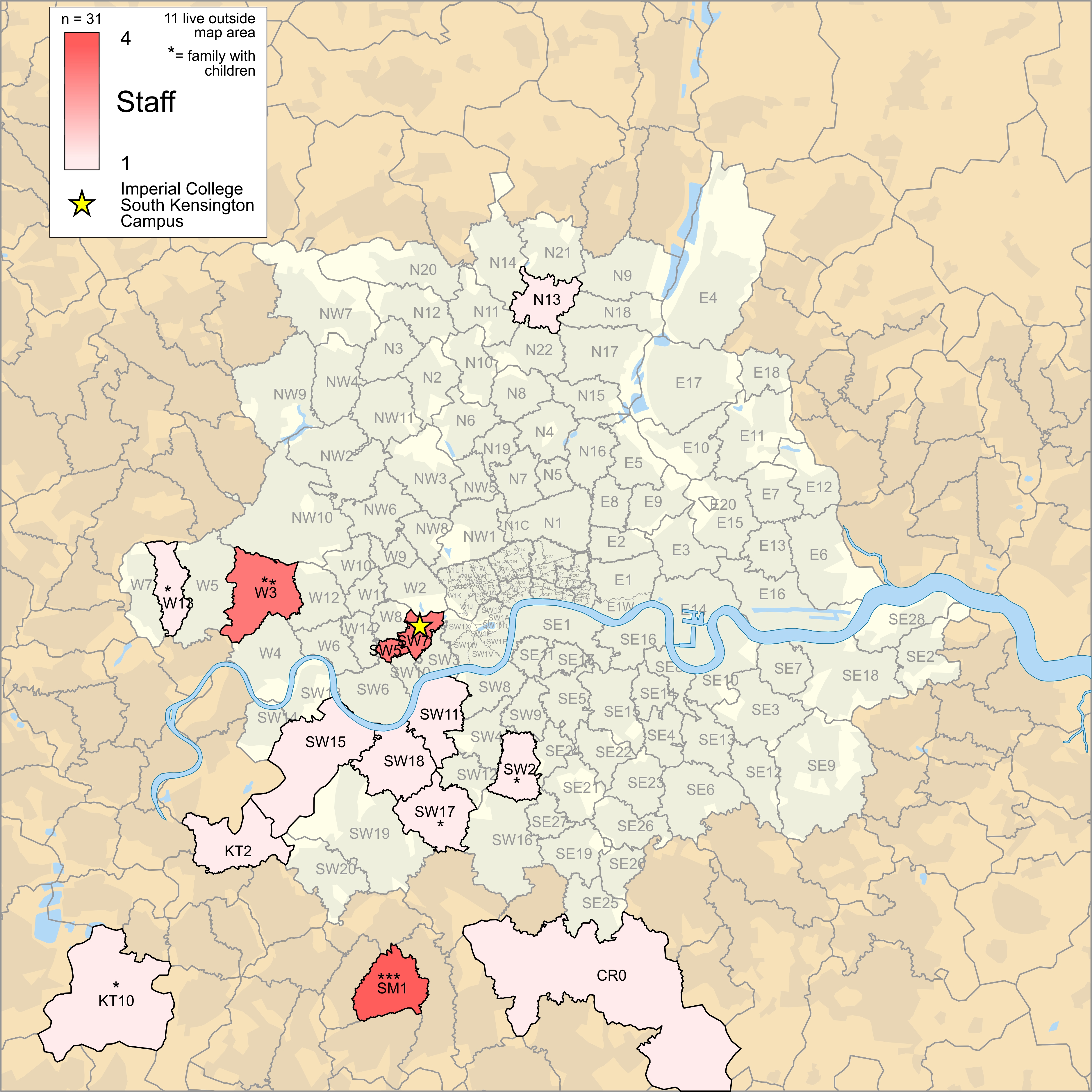 If you are new to London you may not be sure where to live. There are many different boroughs, some of which have better transport links than others, some are very expensive and out of the reach of all but the super rich but some of the cheaper places to live are less desirable. To provide a starting point for your search for a home the maps below show the boroughs where our PhD students, postdocs and academic staff live. The academic staff map also shows where those with families live.