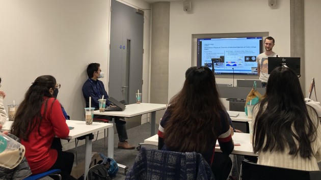Zewei, a PhD student in the group, presents his work on carrier and ion transport in Cs2AgBiBr6 double perovskites at the Centre for Advanced Materials for Integrated Energy Systems (CAM-IES), held at Robinson College in Cambridge. Find out more about Zewei in our Team page.