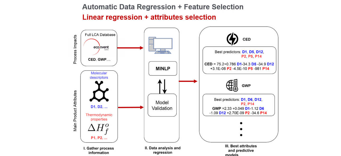 Current LCA repositories contain information of a limited number of chemicals. Through the development of short-cut methods of sustainability performance, we can estimate the environmental impact of chemicals currently missing in LCA databases, thereby enabling the fast screening of alternative chemical routes. To build our models, we combine mathematical programming with multi-variate statistical methods in order to identify key structural and thermodynamic properties of a chemical most strongly connected to its environmental performance.