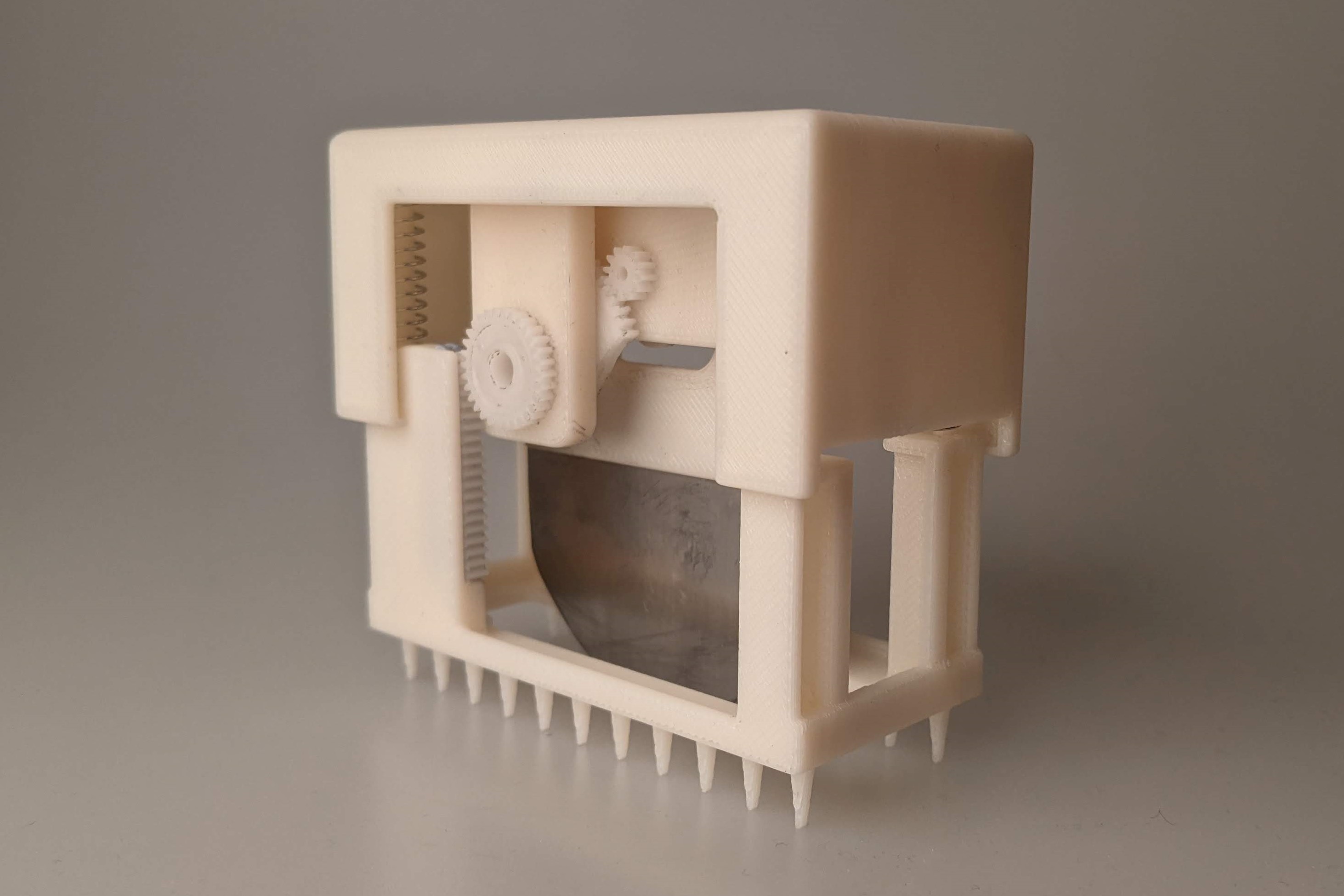 The transmission system of the tool takes the input force and drives a blade in an oscillating and downward motion, mimicking the cutting motion of conventional knives. Retractable prongs on the base of the design act to hold the food in place – a feature that many competing assistive tools failed to include.